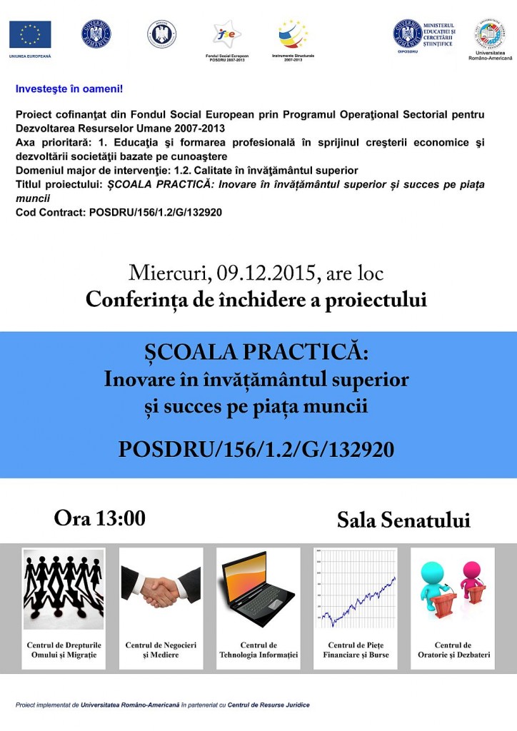 Echipa management a proiectului ?COALA PRACTIC?: Inovare în înv???mântul superior ?i succes pe pia?a muncii, cod POSDRU/156/1.2/G/132920, implementat de c?tre Universit??ii Româno-Americane ?i Centrul de Resurse Juridice, v? invit? miercuri, 9 decembrie 2015, în Sala Senatului Universit??ii Româno-Americane, începând cu ora 13:00, pentru a participa la conferin?a de închidere a proiectului.