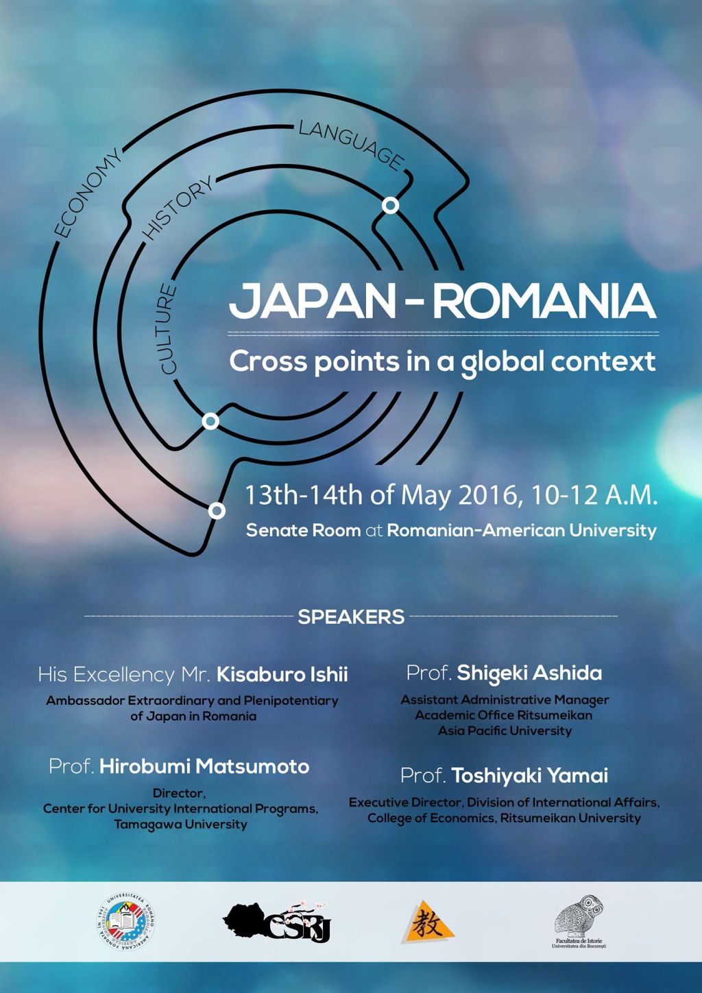 Conferin?a este organizat? în parteneriat cu Ritsumeikan University din Kyoto, Institutul de Economie Mondial? al Academiei Române, Facultatea de Istorie – Universitatea Bucure?ti ?i Asocia?ia Profesorilor de Limb? Japonez? din România.